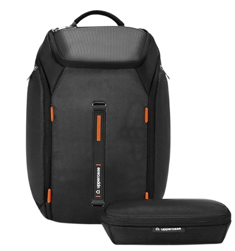 Water-resistant, trolley sleeve, and tech pouch for travel-ready performance.